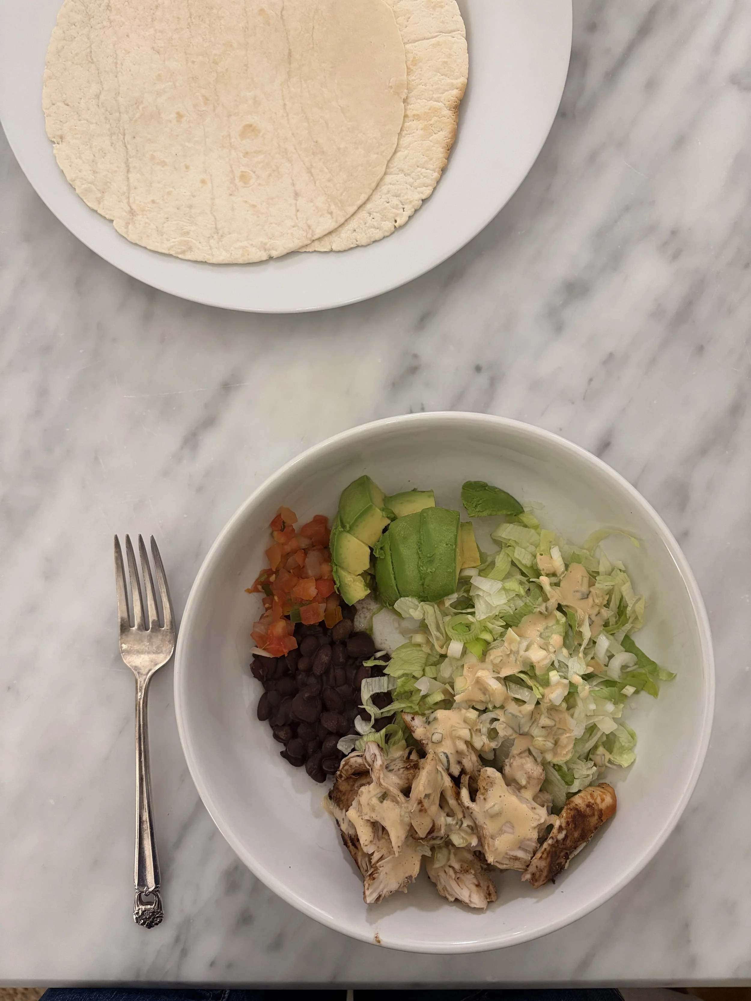 Seriously, everything in your fridge can be a salad if you manifest. I usually throw whatever protein we have into a bowl with lettuce (or literally whatever greens are left) and the rest of our veggies. Toss with olive oil, mustard (or vinegar/lemon juice) and salt. This is a great idea for when you need to clean out your fridge!